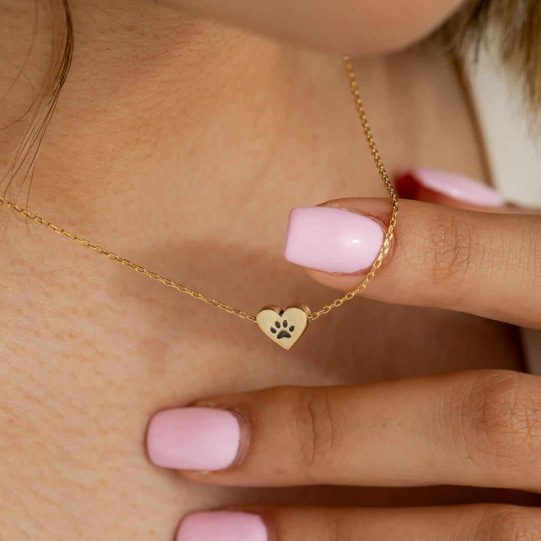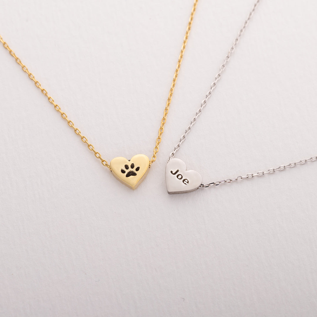 Crafted from high-quality 925 sterling silver, the Double Sided Engraved Heart with Paw and Name Necklace is available in both gold and rose gold plating options. The heart pendant measures 7mm, and the blackened finish ensures that the engraving is bold and visible, providing a lasting impression.