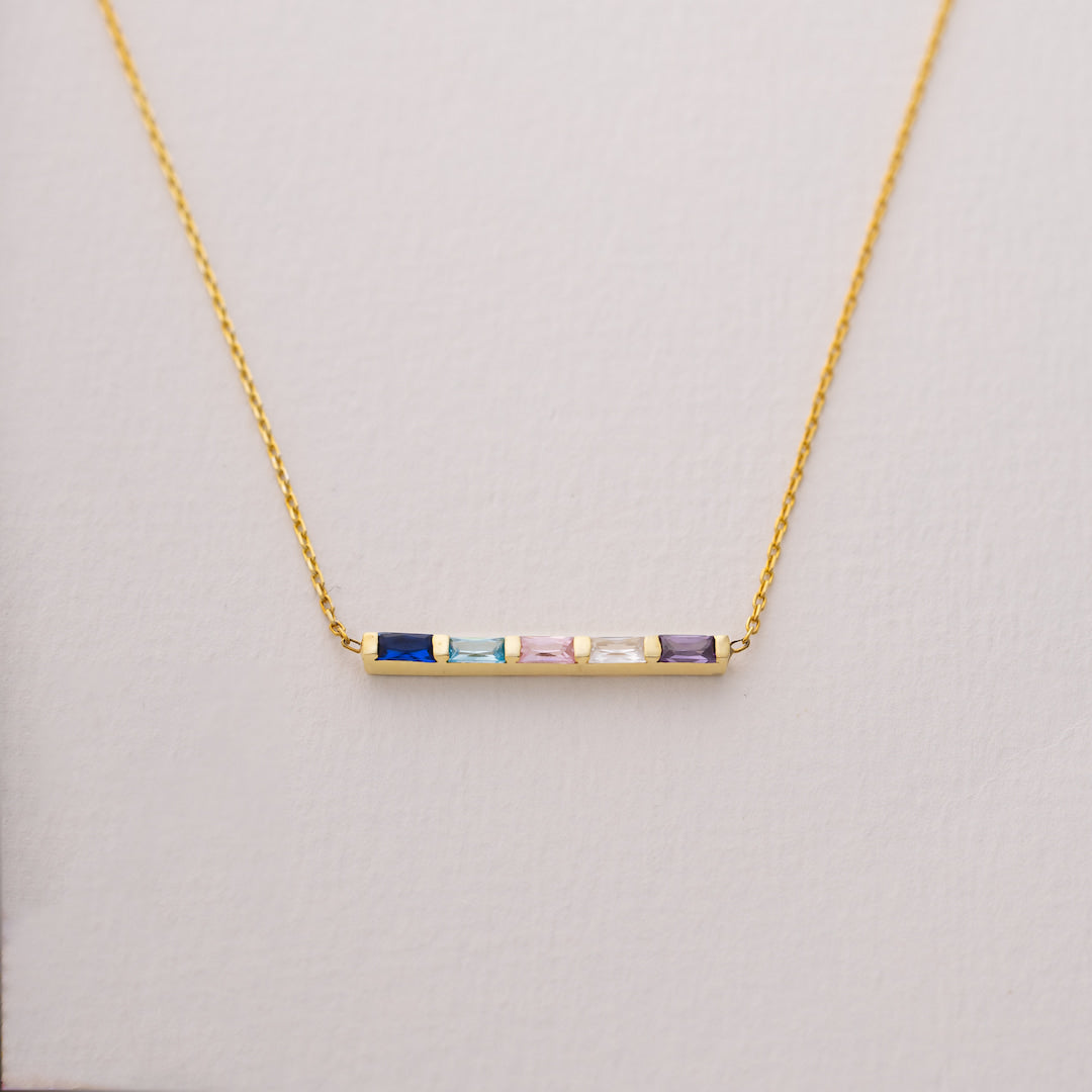 Celebrate your loved ones with our Baguette Birthstone Necklace. A row of beautifully cut stones represents each birth month, creating a personal, meaningful piece. Sleek, modern, and perfect for everyday wear or layering with your favorite necklaces.