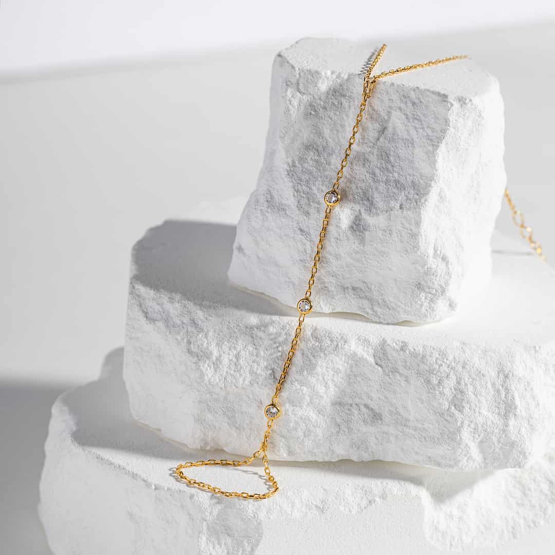 A slim bracelet connects to a sleek finger loop with a line of shimmering stones—creating a graceful, eye-catching look in one effortless piece. Featherlight and comfortable for weddings, nights out, or adding something unique to everyday style.