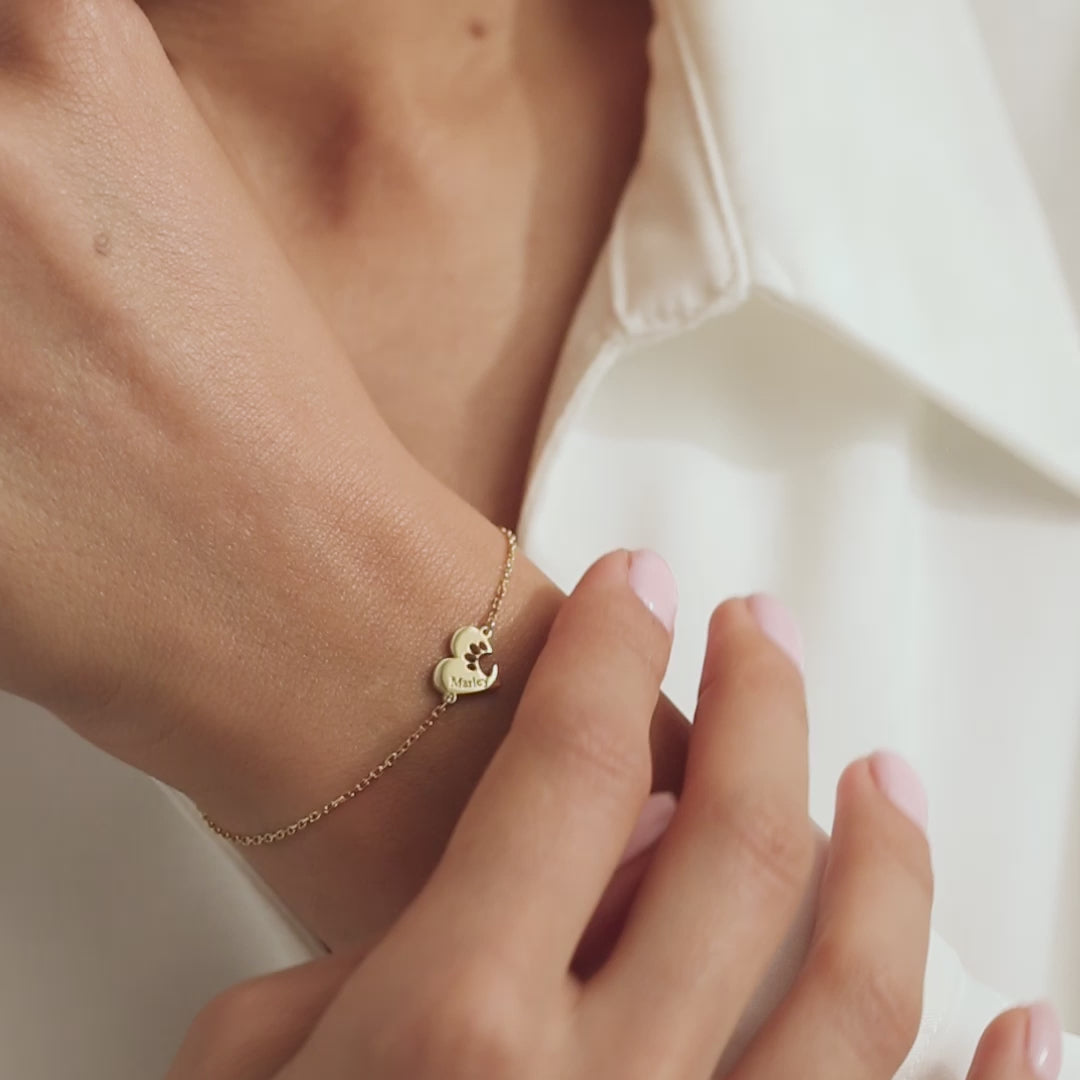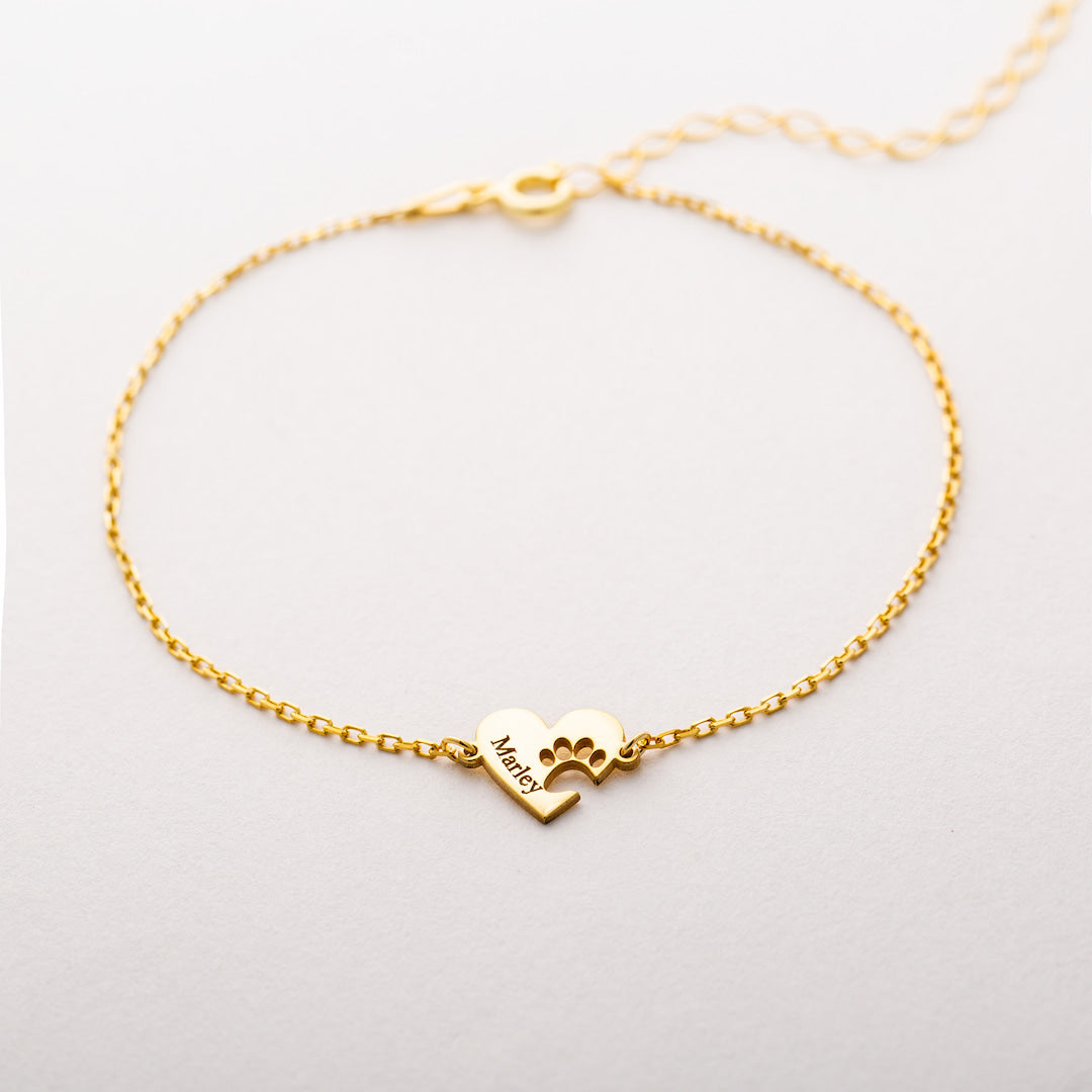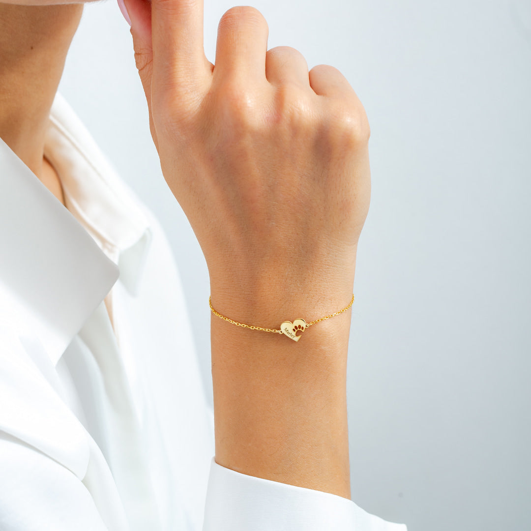 Celebrate your furry friend with this Engraved Heart Paw Bracelet. A tiny paw nestled in a heart makes it a charming and personal piece. Add a name or special word to make it truly yours. Minimal, meaningful, and perfect for everyday wear.