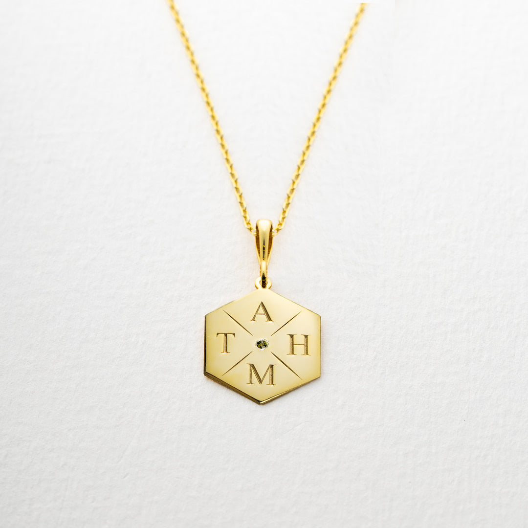 This personalized geometric pendant necklace features custom engraved initials on the front, beautifully arranged around a sparkling birthstone set at the center. Designed to celebrate meaningful connections, the back of the pendant can also be engraved with a date, name, or short message for added personalization.