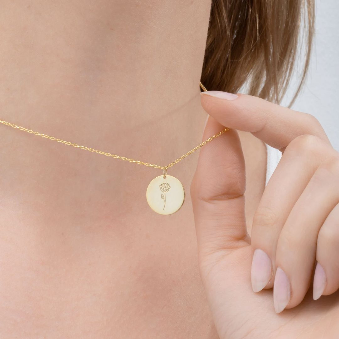 Introducing our special Personalized Birth Flower Disk Charm Necklace! This necklace features a beautifully crafted disk with your birth flower on it. Each flower represents a different month, making it unique to you. The delicate design is made with care and comes with a fine chain. Wear it close to your heart or give it as a thoughtful gift to someone special.